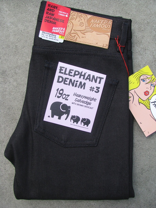 Naked & Famous "Skinny Guy" Elephant 3 19oz Selvedge Denim in Deep Indigo. 100% cotton. Made in Canada. Sizes 28-34, 36. $175. For more information on the Skinny Guy Elephant 3 denim click here.